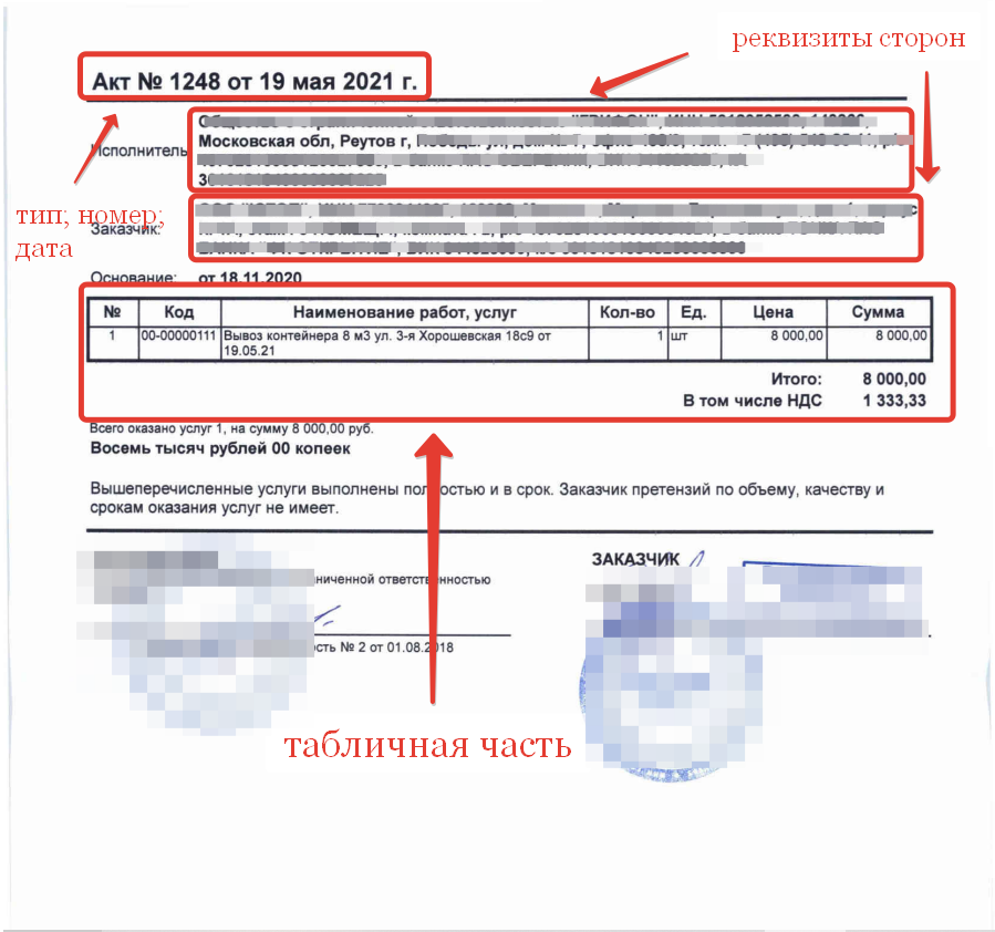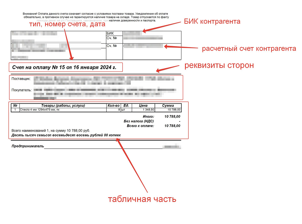 Для удобства из документов извлекается только важная и нужная информация: тип, номер, дата, реквизиты контрагентов, табличная часть. Покажем на примере некоторых документов.