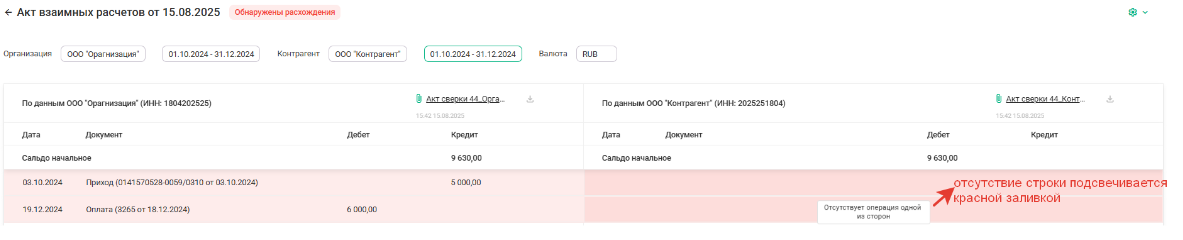 3) Отсутствие операции. Если документ есть только у одной стороны, строка подсвечивается: