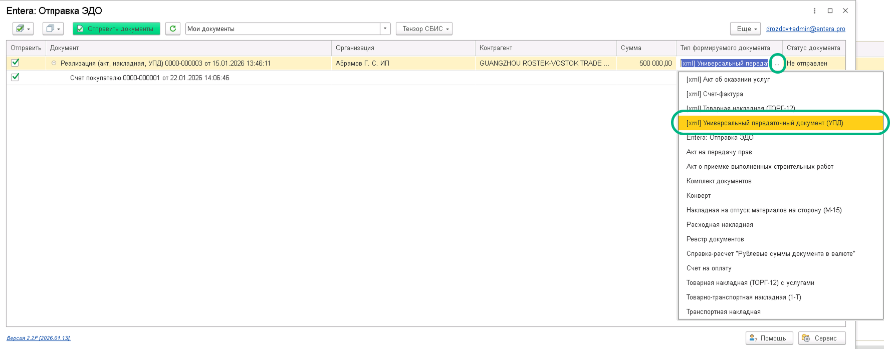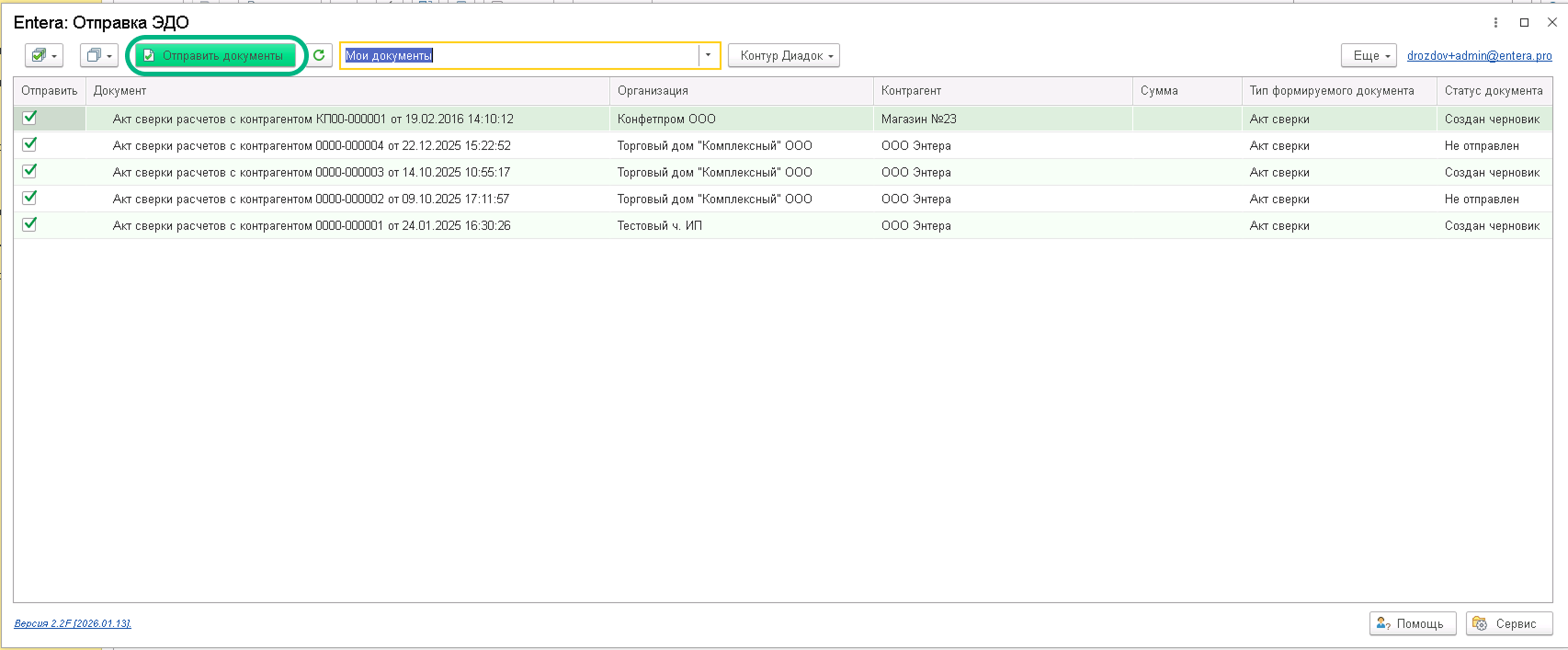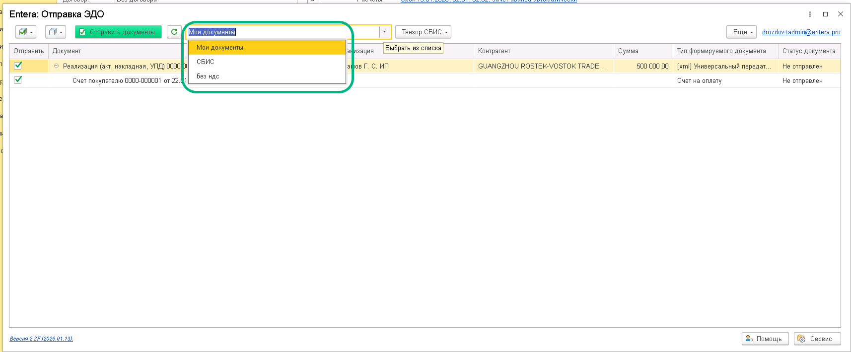 Инструкция по отправке документов из 1С в Диадок через Entera