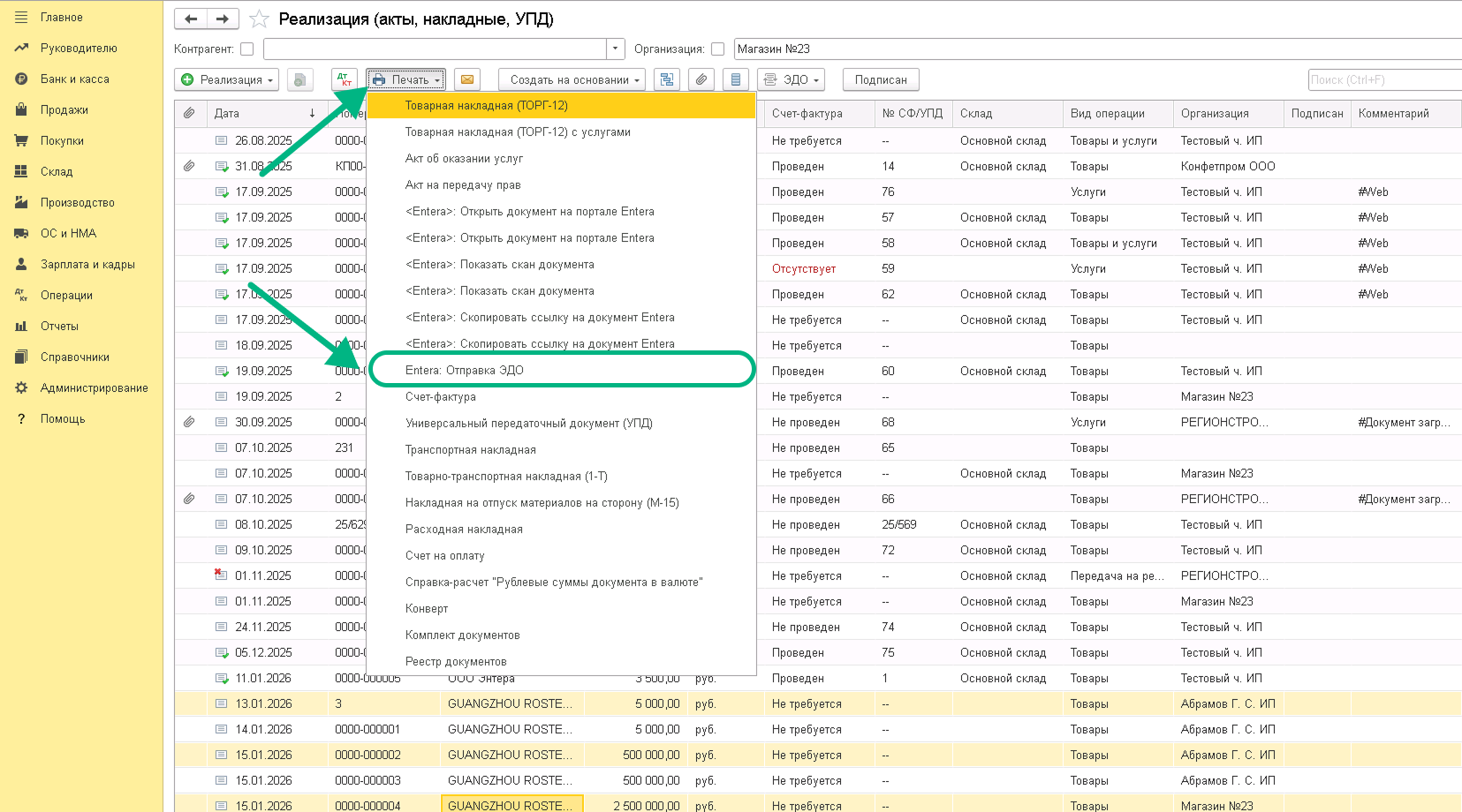 1. Зайдите в раздел «Продажи» - «Реализация» (или «Документы продажи»), выберете нужную Реализацию для отправки и нажмите кнопку «Печать» - «Entera: Отправка ЭДО».