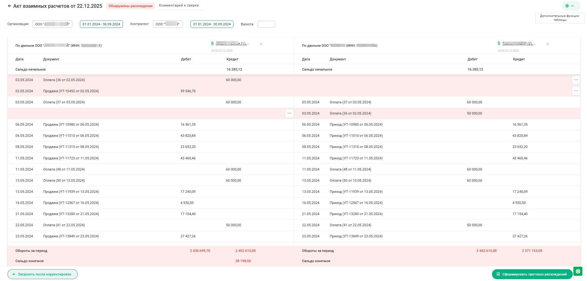 2) расхождения обнаружены – можем скачать протокол расхождений для себя или контрагента.