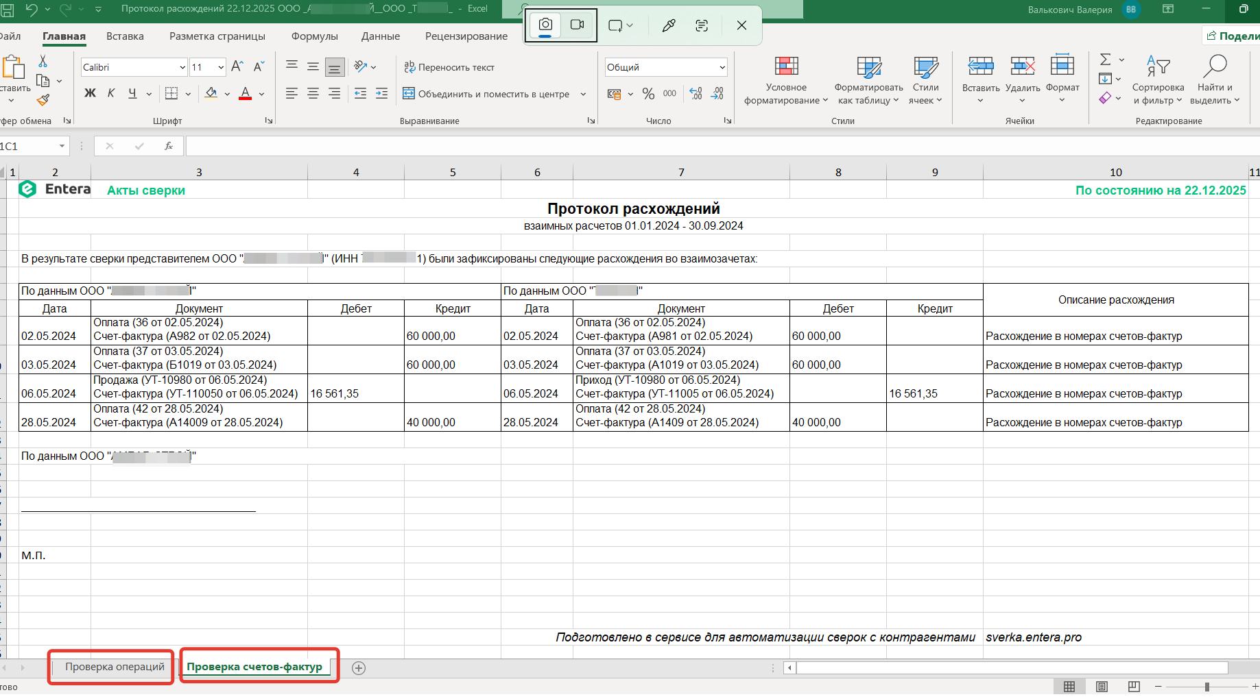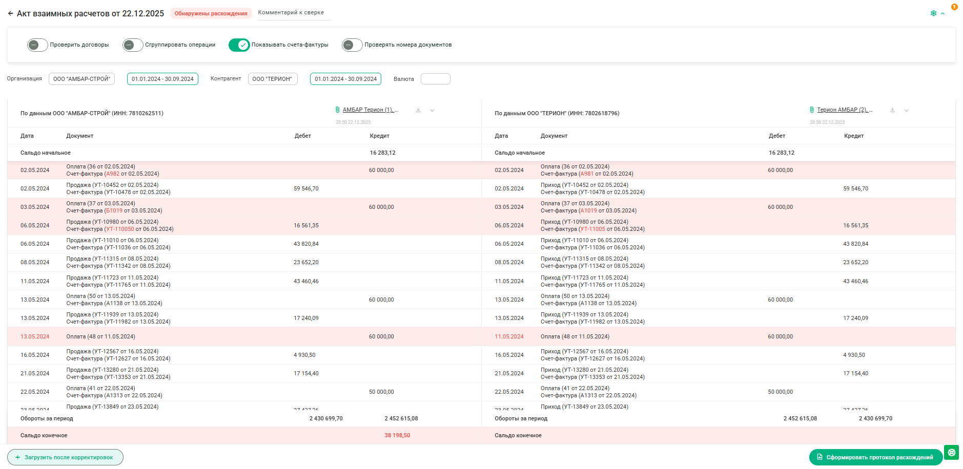 3. В процессе сверки Entera Акты сверки построчно проверяет данные и показывает расхождения.