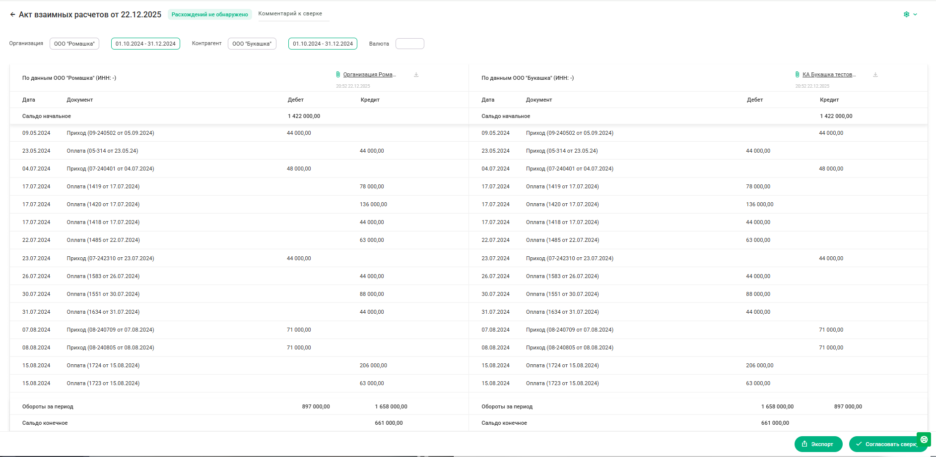 1) расхождений не обнаружено – можем скачать акт сверки для подписания;