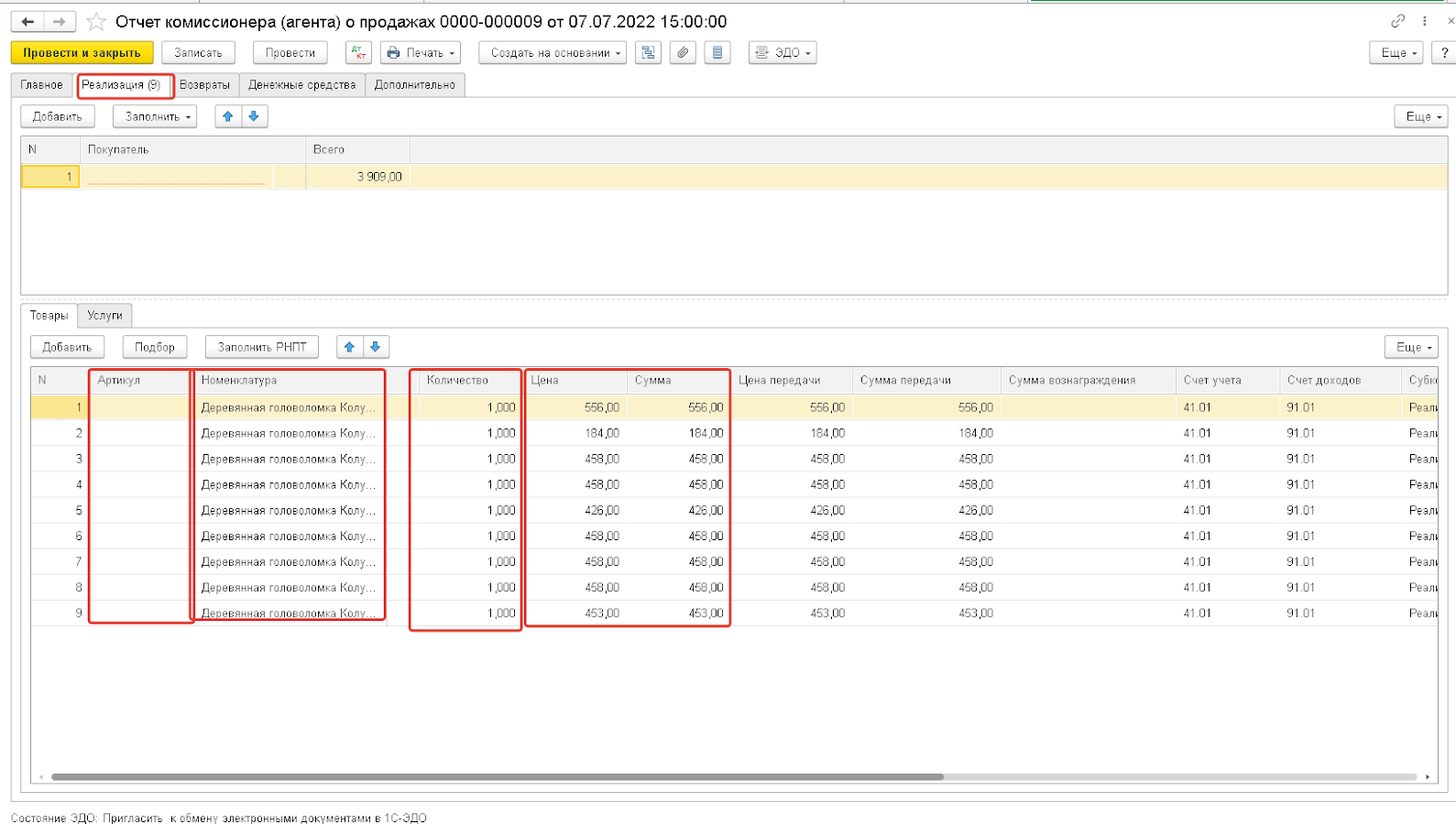 Важно: информацию в разделах «Сумма вознаграждения», «Скидки», «Комиссия», а также табличную часть «Возвраты» следует заполнить самостоятельно.