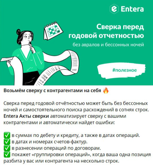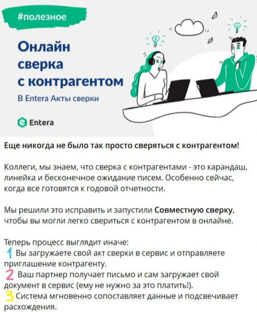 Для всех присутствующих на вебинаре будет уникальная возможность начать работать с Entera Акты сверки бесплатно. Что это значит?